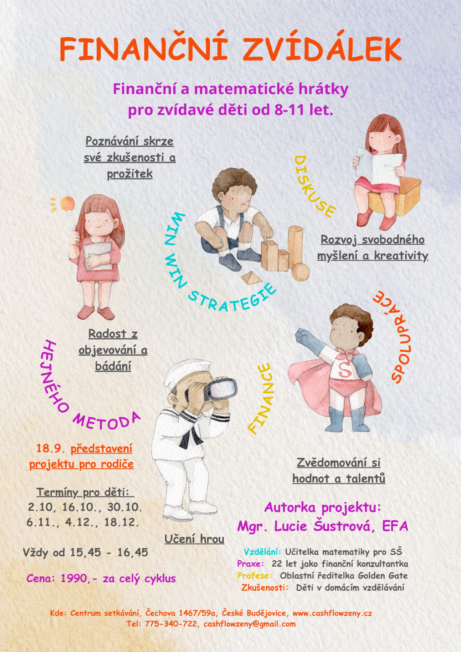 Děti jsou od přírody zvídavé a s nadšením zkoumají svět kolem sebe. Popořte je v objevování svého vlastního bohatství. Porozumět světu peněz a ekonomiky je nezbytné pro budoucí hojnost a spokojenost. Na finančních příbězích a úkolech si s dětmi vytvoříme svoji ideální společnost. Objevíme jednoduchá finanční pravidla, která jsou postavená na lidských hodnotách jako je spolupráce, respekt, důvěra, svoboda a zodpovědnost. Kromě finančních znalostí se vyzkouší vyjádřit svůj názor, argumentovat, navrhovat konstruktivní řešení, rozvíjet představivost a tvořivost, naslouchat kamarádům, respektovat odlišný názor a přemýšlet způsobem win win.